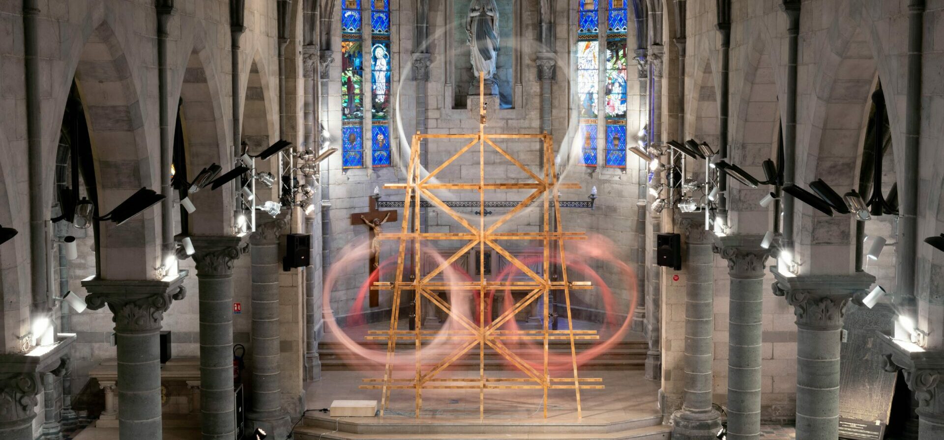 Pour l’Église Notre-Dame de Lourdes, le duo présente Fanions et Carillons, une œuvre commandée par l’Abbaye de Fontevraud en 2023 et présentée dans la Chapelle Saint-Benoît. Cet automate rend hommage à l’horloge historique de l’abbaye, en prenant vie à chaque heure et chaque demi-heure. Sa mécanique, simple et rudimentaire, ne produit pas le son des cloches, mais anime des tissus. Un ensemble de quatorze fanions inertes s’éveillent successivement, créant des formes éphémères qui se métamorphosent et se répondent. Tel un carillon silencieux, cette chorégraphie visuelle génère une mélodie visuelle, d’une durée de quelques minutes, se répétant à intervalles réguliers. Véritable symphonie éphémère de tissus !