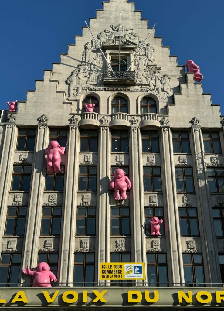 ↑ Vue de l’installation « Monsieur Rose » sur la façade de La Voix du Nord à Lille dans le cadre de Fiesta 7ème édition de lille3000, © lille3000