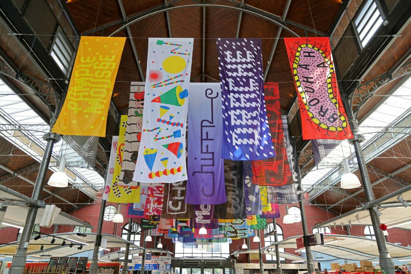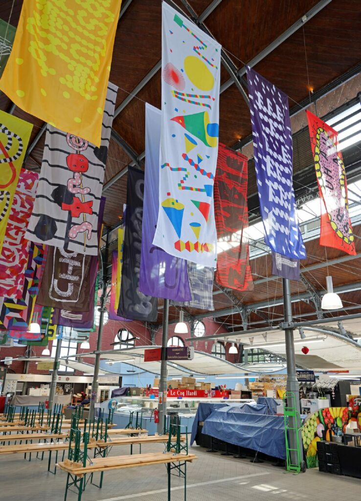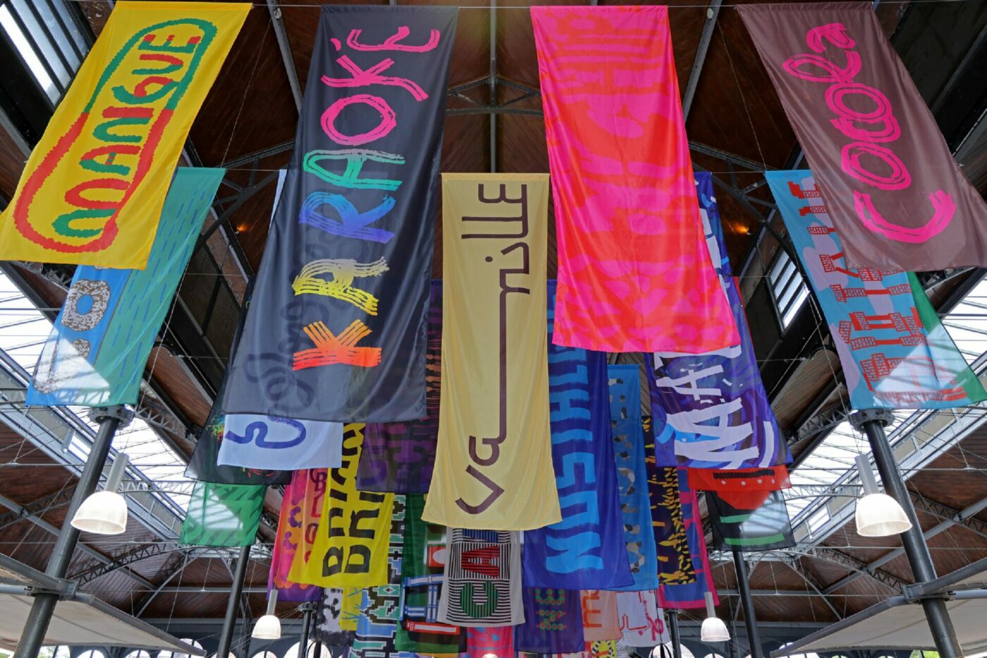 Pour Fiesta, sa 7ème édition thématique, lille3000 invite les artistes à réactiver leur pièce, adaptée au thème et à l’espace des Halles de Wazemmes avec une sélection de mots qui prennent leurs racines dans les cultures festives et culinaires d’ailleurs.